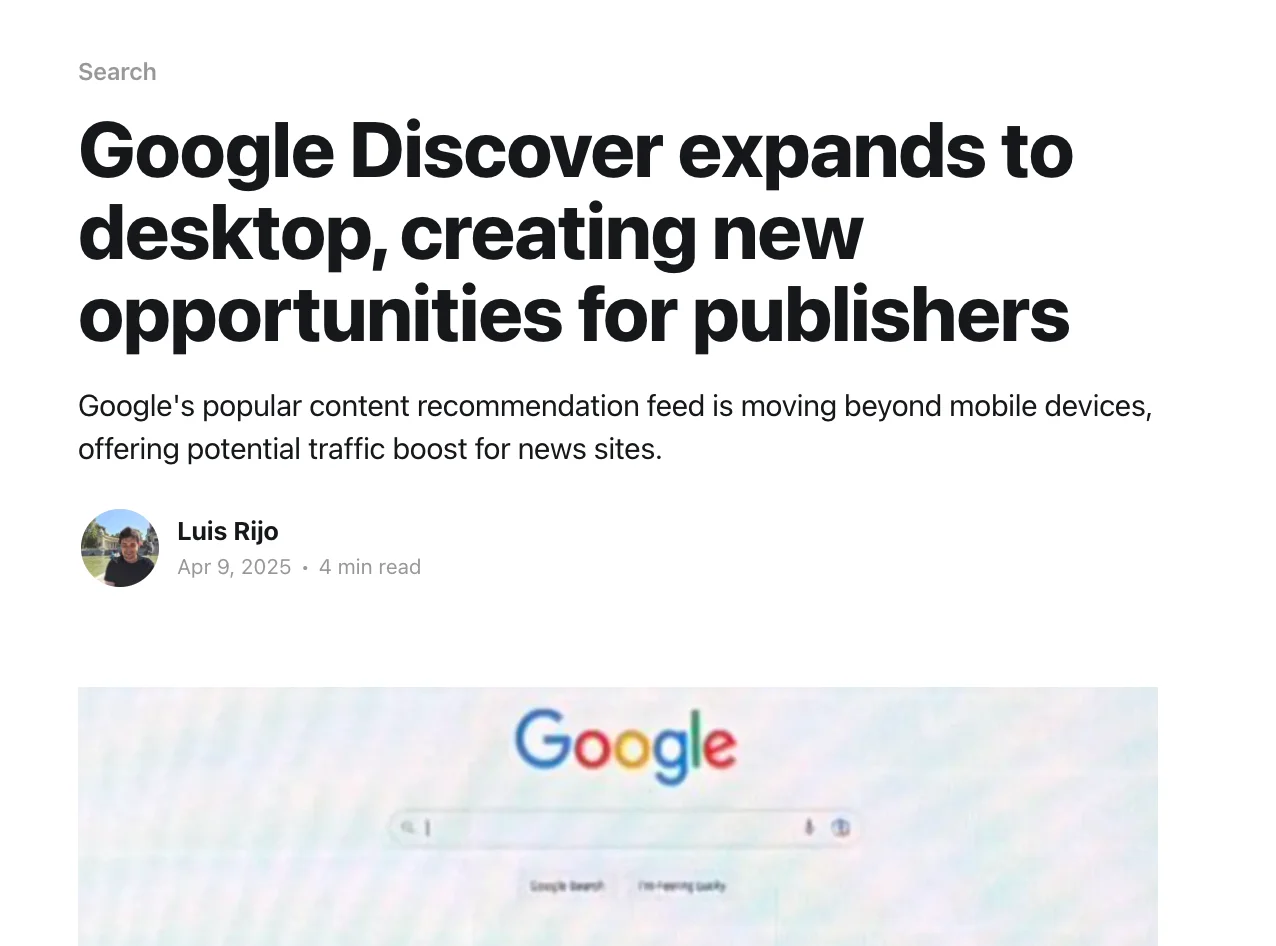 이미 많은 뉴스 사이트에서 디스커버는 전체 트래픽의 최대 60%까지 차지하고 있으며, 데스크톱 확장을 통해 약 10~15% 추가 트래픽 유입이 기대됩니다.